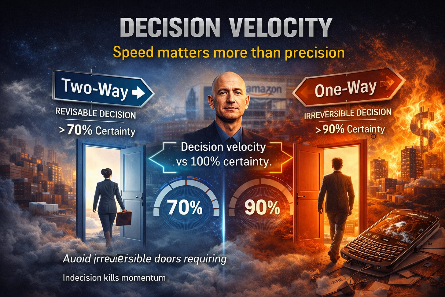 Jeff Bezos established this distinction at Amazon, categorizing reversible decisions as "two-way doors" that require swift processing. The key is distinguishing these from irreversible “one-way doors” such as a massive capital expenditure or a brand merger. Those deserve the 90% data treatment. Without a framework for decision velocity, your organization downshifts into a defensive posture that kills momentum.