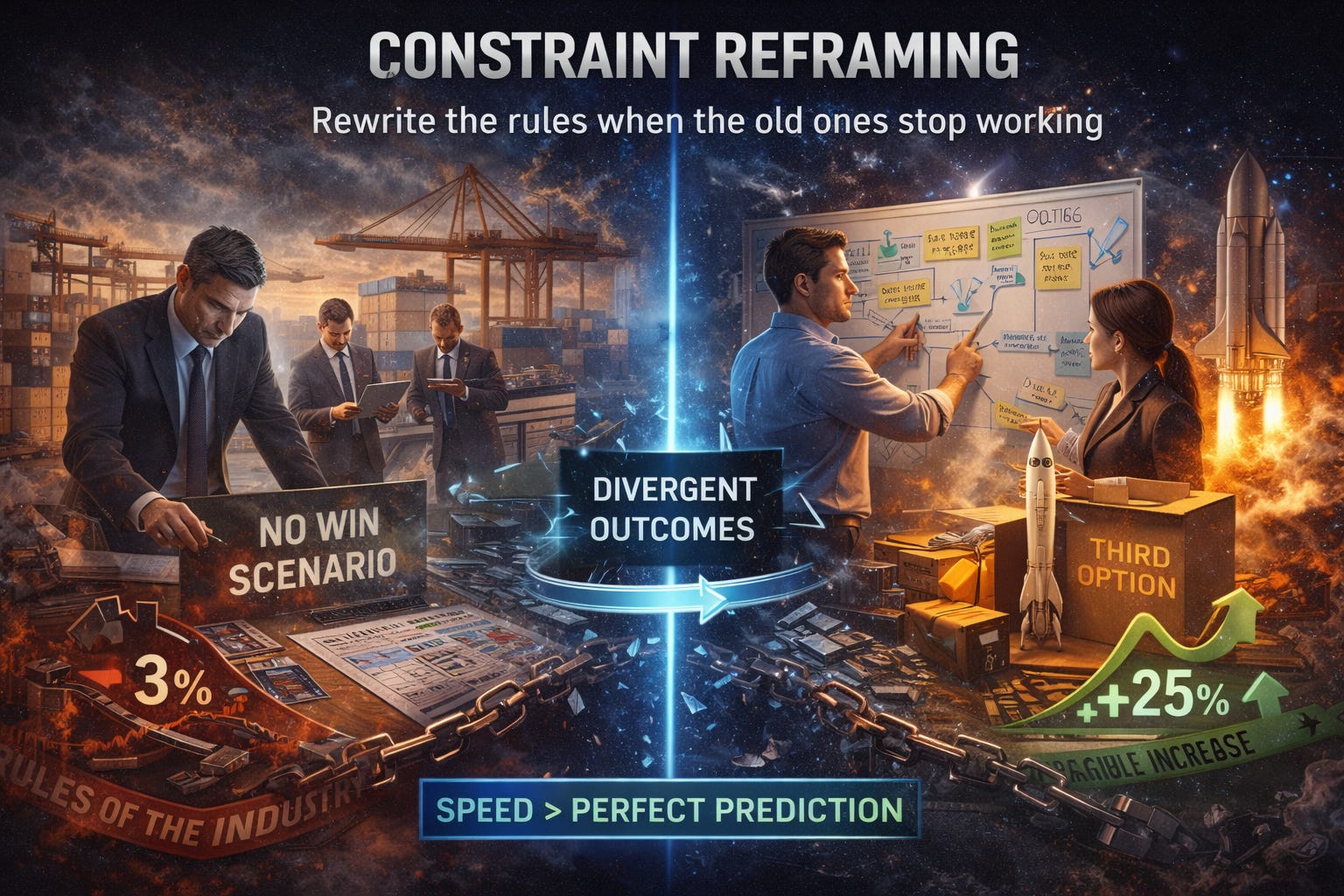 Without oversimplifying the causes, the divergence in outcomes within the freight-tech sector illustrates the principle: speed of constraint reframing beats perfect prediction in a downturn. This mirrors the agility of SpaceX, which proved reusability wasn’t impossible, just mispriced. That’s what rewriting the rules looks like when the old ones stop working. Without reframing, you are simply competing for the same margins as everyone else.