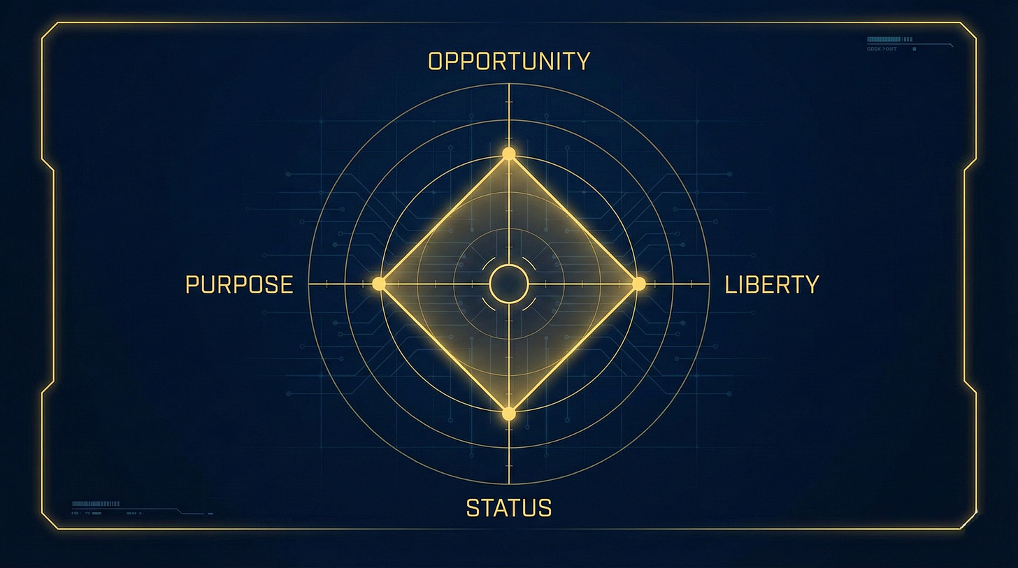 You cannot design a winning strategy until you understand the engine driving the vehicle. Most entrepreneurs fail because they build a business that contradicts their core nature. They chase “Opportunity” when they value “Liberty,” or they chase “Status” when they value “Purpose.”