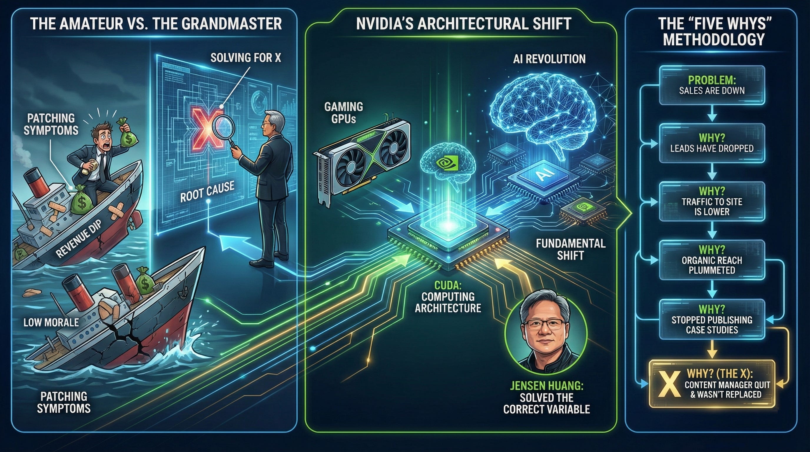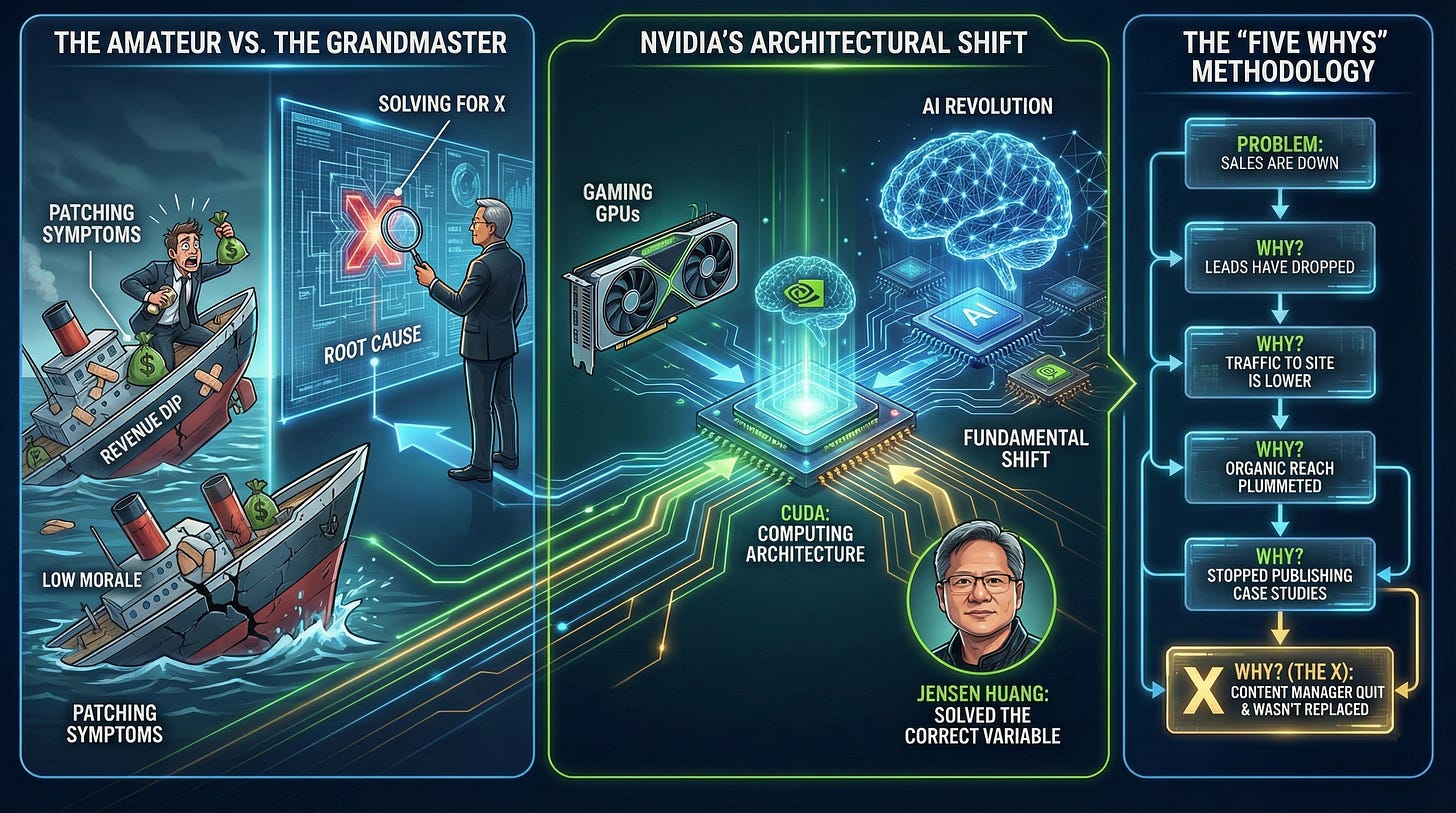 When revenue dips or morale sinks, the amateur leader panics and tries to patch the symptom. They throw money at marketing or host a team lunch. The grandmaster stops, looks at the data, and digs for the root cause. This is called “Solving for X.”