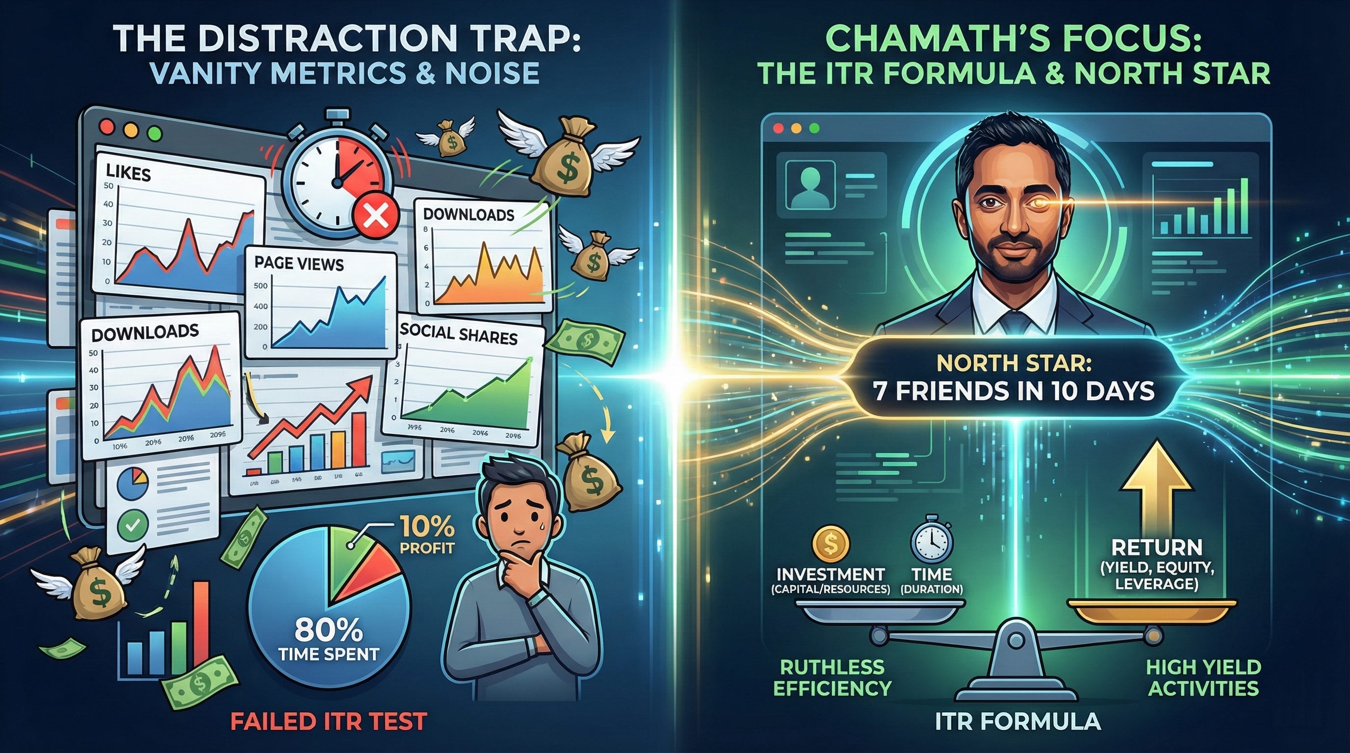 Palihapitiya famously ignored “vanity metrics” and focused his team on a single, proven lever for growth: getting a user to seven friends in ten days. Everything else was noise. This is the ITR formula in action; if the investment of time didn’t directly impact that core metric, it was discarded.