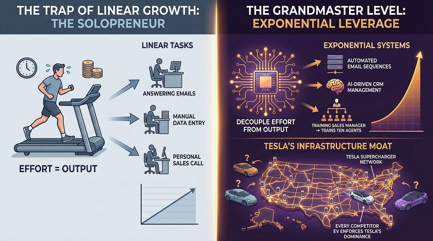 The trap of the “solopreneur” is linear growth. You work an hour; you get paid for an hour. To reach the grandmaster level, you must decouple effort from output.