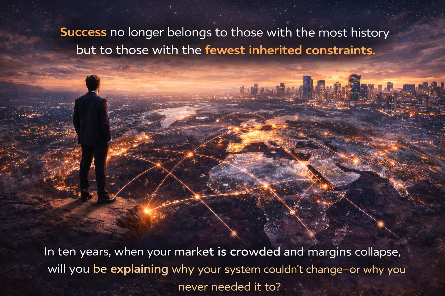 The map of global business has been redrawn. Success no longer belongs to those with the most history but to those with the fewest inherited constraints. In ten years, when your market is crowded and margins collapse, will you be explaining why your system couldn’t change—or why you never needed it to?