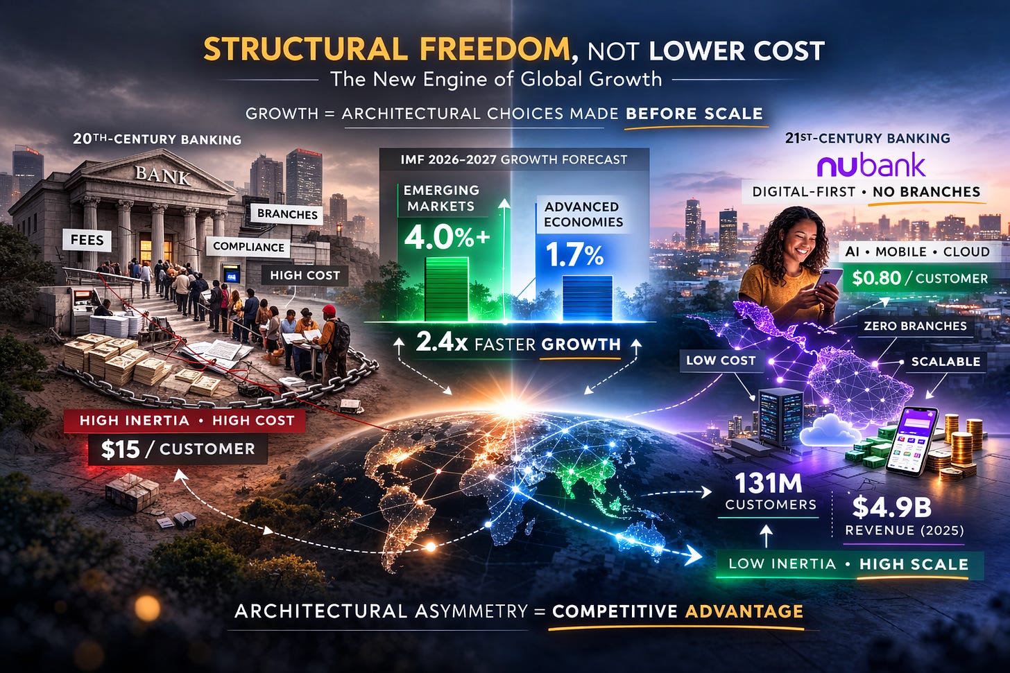 According to the IMF’s January 2026 World Economic Outlook, emerging market and developing economies are projected to grow at over 4.0% through 2027—more than double the 1.7% forecast for advanced economies. That gap is the result of what I call Architectural Asymmetry: building systems that never had to optimize for 20th-century requirements in the first place.