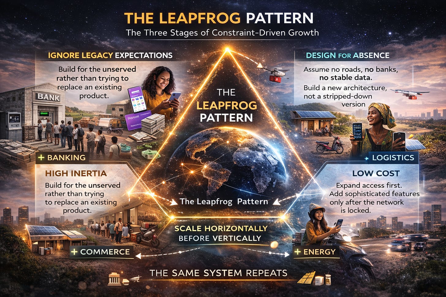 The same playbook keeps surfacing across banking, logistics, commerce, and energy. That’s not a coincidence—it’s a system. The Leapfrog Pattern runs through three distinct stages: