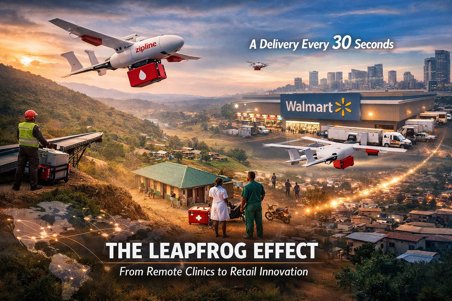 The Leapfrog Effect is most visible in physical logistics. Zipline, now valued at $7.6 billion, is expanding across North America not by competing with delivery vans, but by competing with the idea that a van needs a road at all.