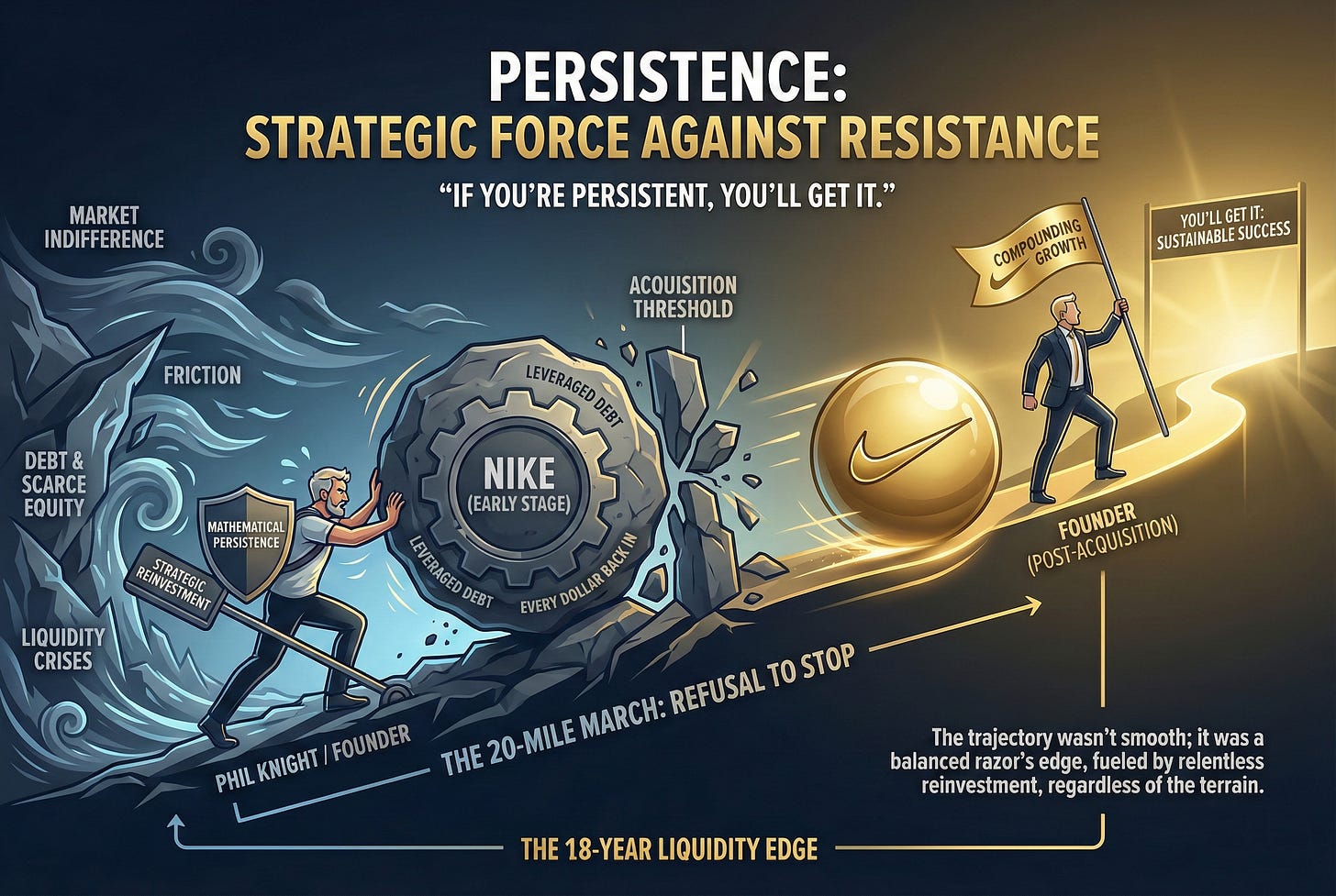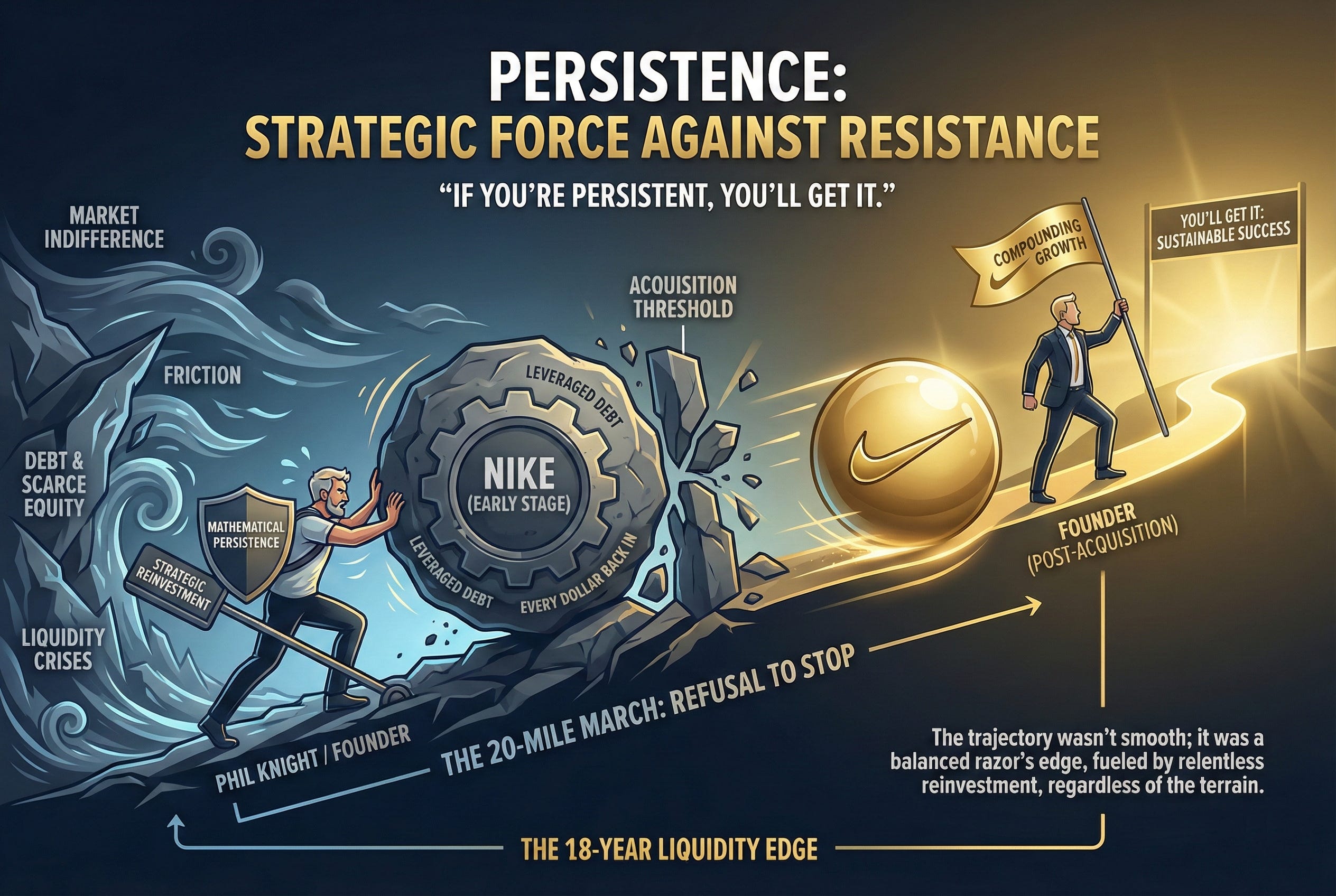 Consider the trajectory of Phil Knight, co-founder of Nike. As detailed in his memoir Shoe Dog, Knight didn’t build Nike on a smooth upward curve. For eighteen years, he built Nike while constantly managing liquidity crises. His persistence wasn’t emotional; it was mathematical. He persistently reinvested every dollar, utilizing debt to drive growth during a period when equity investors were limited. This aligns with the “20 Mile March” concept popularized by Jim Collins: the refusal to stop moving, regardless of the terrain.