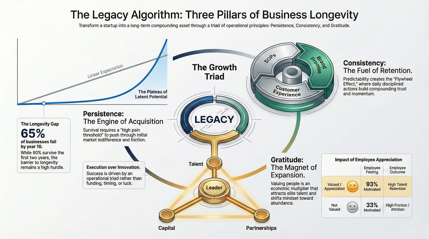 The signal-to-noise ratio in today’s business ecosystem has never been lower. While barriers to entry have dissolved, the barrier to longevity has calcified into an impenetrable wall for the unprepared. According to data from the U.S. Bureau of Labor Statistics updated in 2024, approximately 20% of new businesses fail within two years. By year ten, that number swells to nearly 65%. The differentiator between the minority who scale and the majority who stagnate isn’t funding, timing, or luck; it is adherence to a psychological and operational triad: Persistence to acquire, Consistency to retain, and Gratitude to expand.