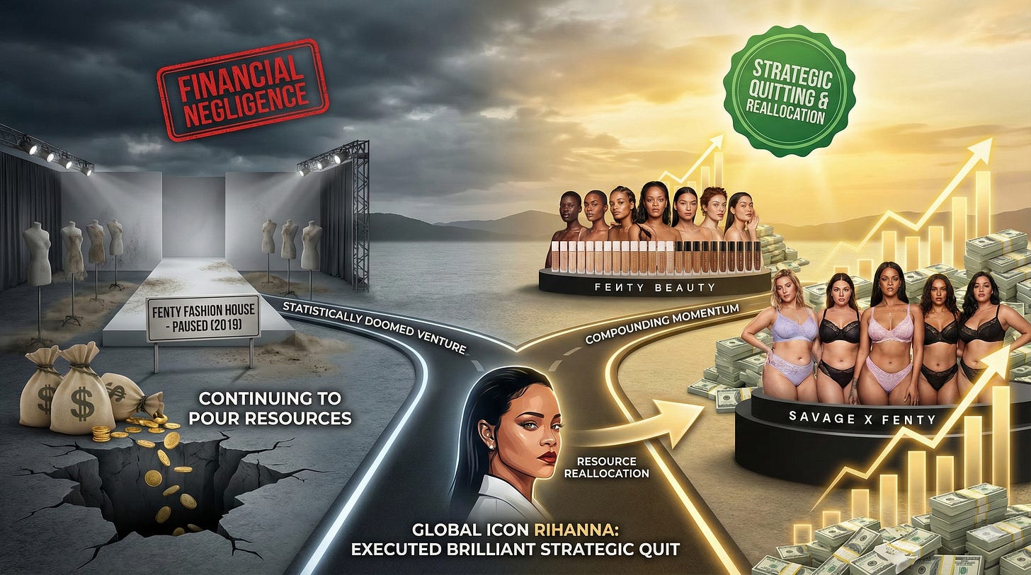 Consider global icon and entrepreneur Rihanna. In 2019, she partnered with LVMH to launch a luxury fashion house, Fenty. However, navigating complex supply chain variables and shifting consumer habits severely damaged the model’s expected value. Rather than bleeding capital to force the brand to work, she executed a brilliant strategic quit by pausing the fashion line entirely. This allowed her to reallocate her resources and double down on Fenty Beauty and Savage X Fenty, where her core unfair advantages (inclusive sizing and makeup shades) were generating massive, compounding momentum.