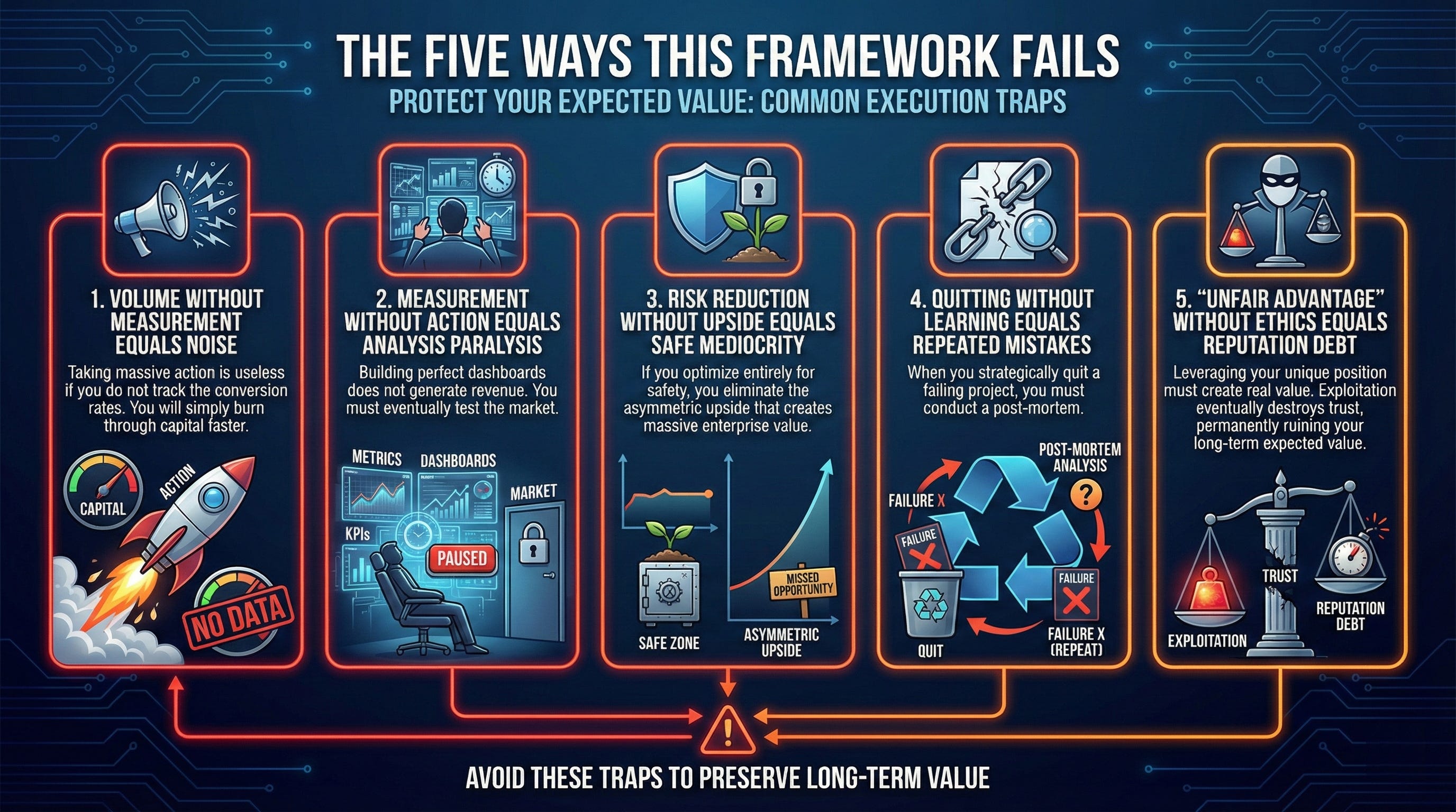 Risk reduction without upside equals safe mediocrity: If you optimize entirely for safety, you eliminate the asymmetric upside that creates massive enterprise value.