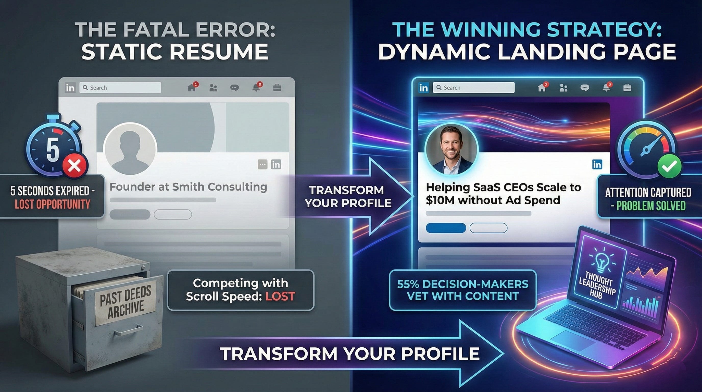 Headline: Delete your job title. Instead of “Founder at Smith Consulting,” use “Helping SaaS CEOs Scale to $10M without Ad Spend.”