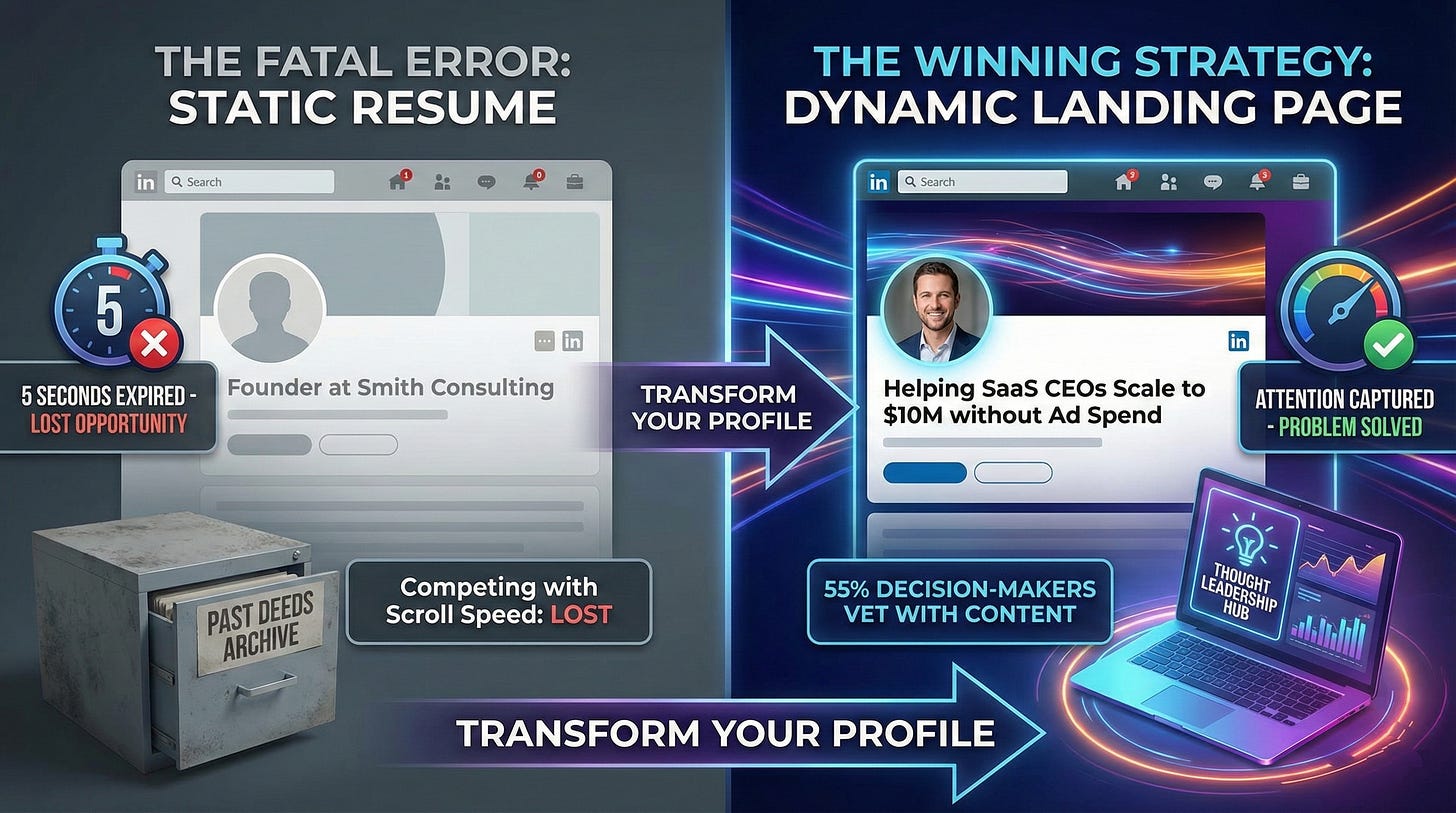 Most entrepreneurs treat their LinkedIn profile like a digital resume—a static archive of past deeds. This is a fatal error. Your profile is not a CV; it is a landing page.