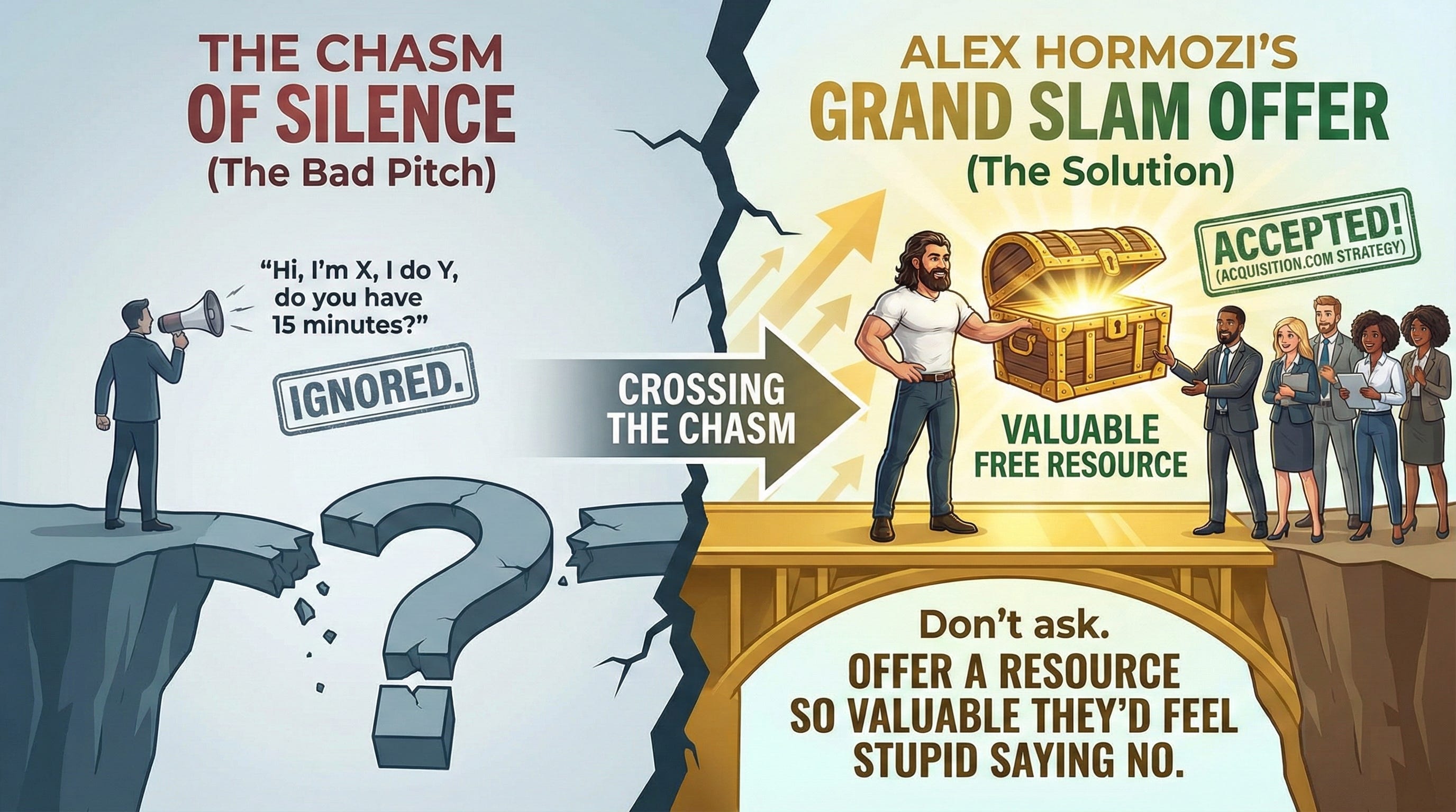 Alex Hormozi, founder of Acquisition.com and the current tactical heavyweight of business strategy, advises a different approach: The “Grand Slam Offer.” Hormozi teaches that you shouldn’t ask for a meeting; you should offer a resource so valuable that they would feel stupid saying no.