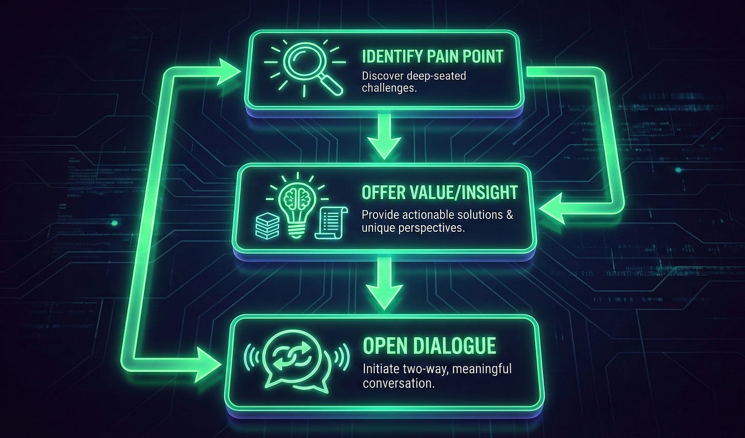 Once you have your profile and your niche, you must cross the chasm of silence. This is where most fail—they pitch. “Hi, I’m X, I do Y, do you have 15 minutes?”