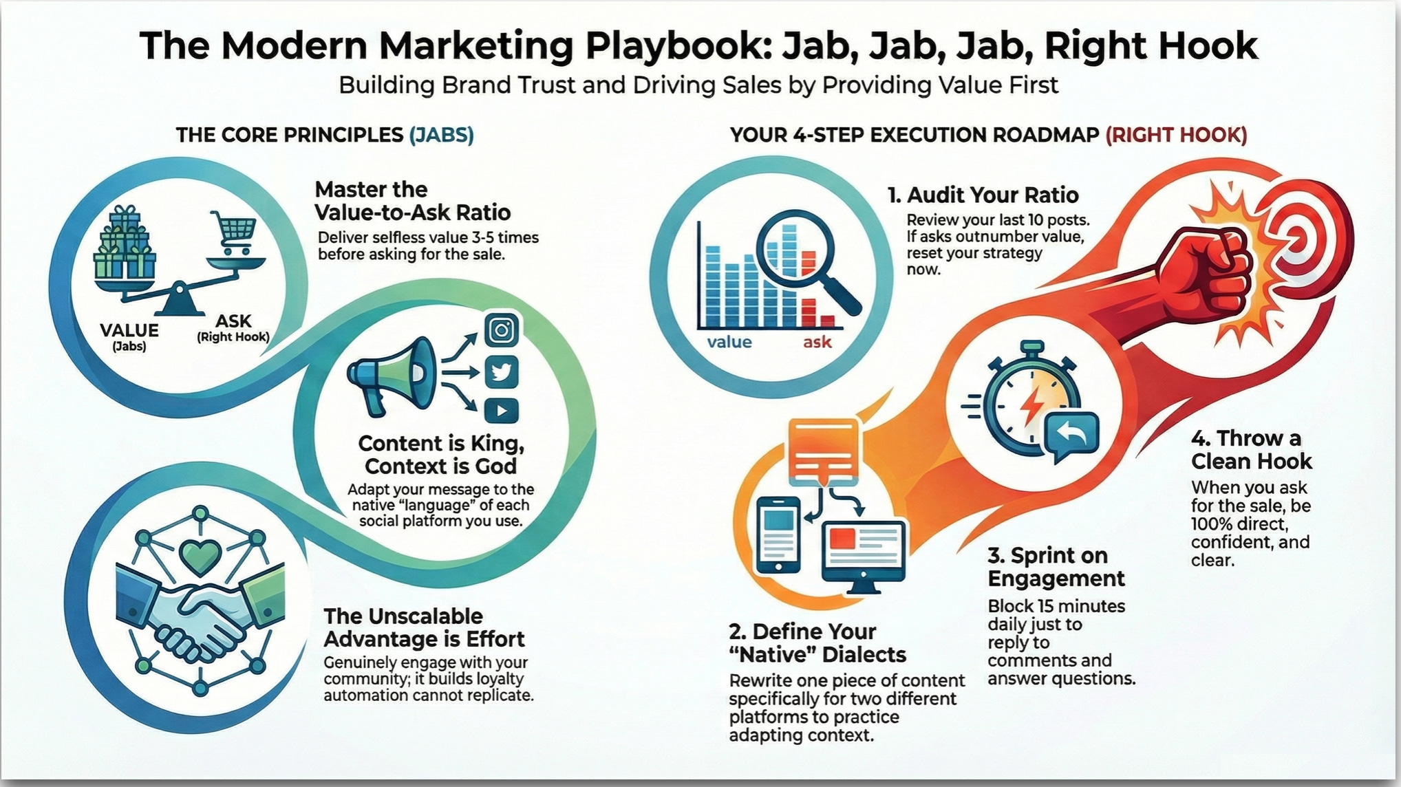 Gary Vaynerchuk’s seminal methodology of “Jab, Jab, Jab, Right Hook” remains the essential playbook for navigating this reality. The boxing metaphor is brutally simple: “Jabs” are selfless pieces of content that entertain, educate, or inspire. They build equity. The “Right Hook” is the ask: the sale, the subscription, the download.