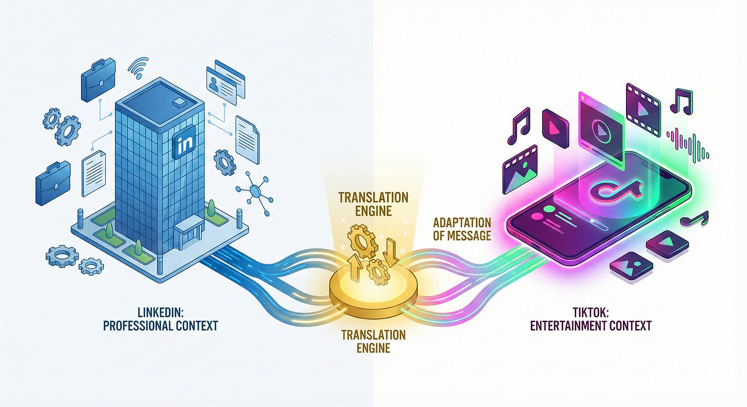 Define Your “Native” Dialects: Choose your two primary platforms. Write down the specific “language” of each (e.g., LinkedIn = Professional Insight; Instagram = Visual Story). Take one piece of content and rewrite it specifically for those two distinct environments.