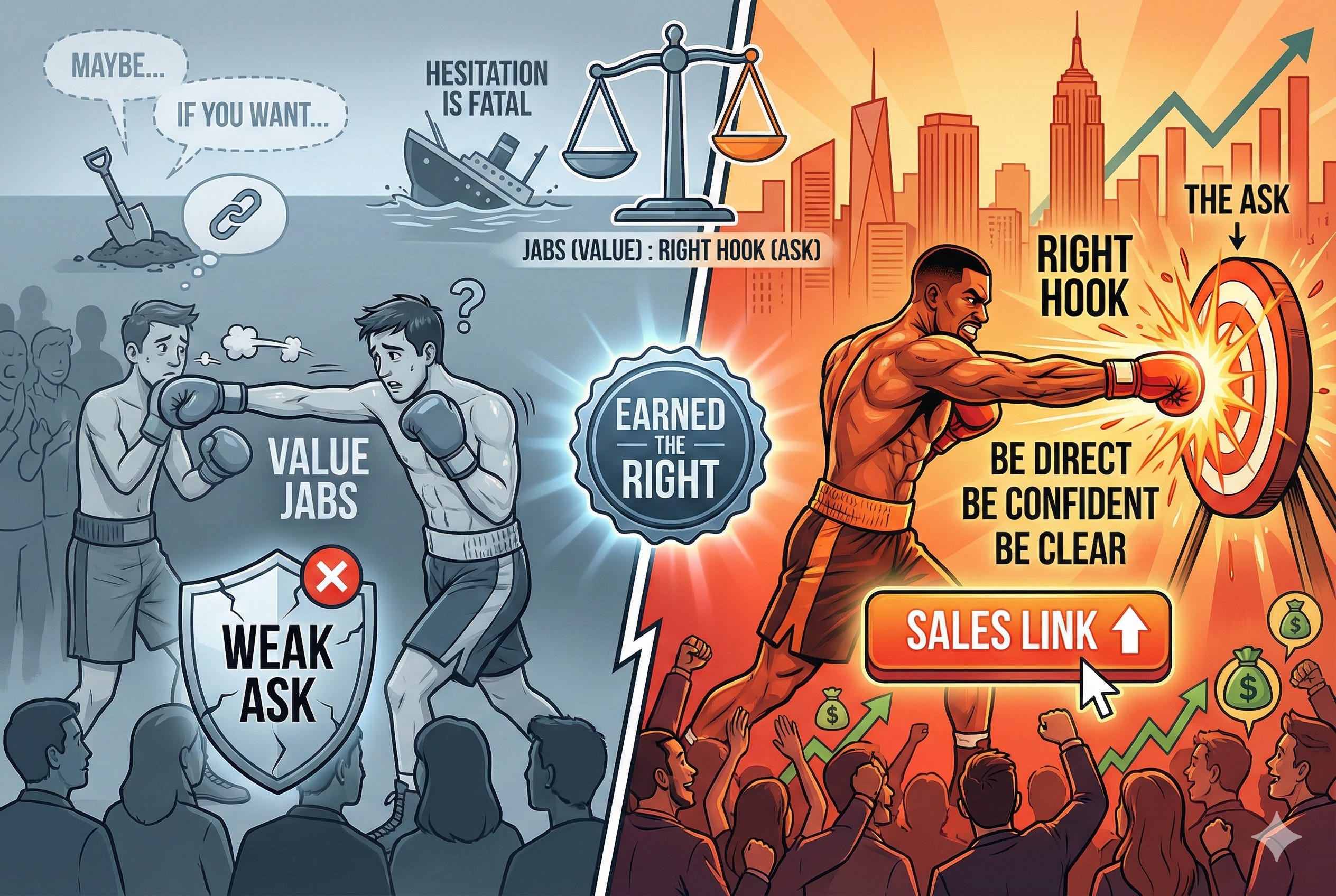 Many entrepreneurs spend months delivering value (Jabs) only to sabotage themselves with a weak ask. They bury the sales link in the comments. They use passive phrases like “if you want” or “maybe check this out.”