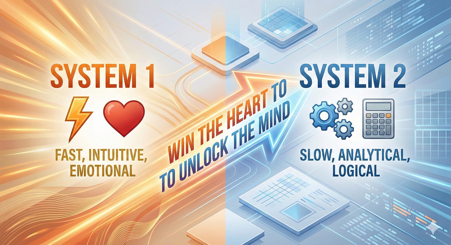Ambitious founders often make the fatal mistake of leading with System 2 data. They dump specs on investors, forcing them into an analytical crouch. A compelling story, however, targets System 1. It creates an immediate emotional hook that bypasses initial skepticism. Once the emotional connection is established, the analytical brain looks for data to justify the gut feeling.
