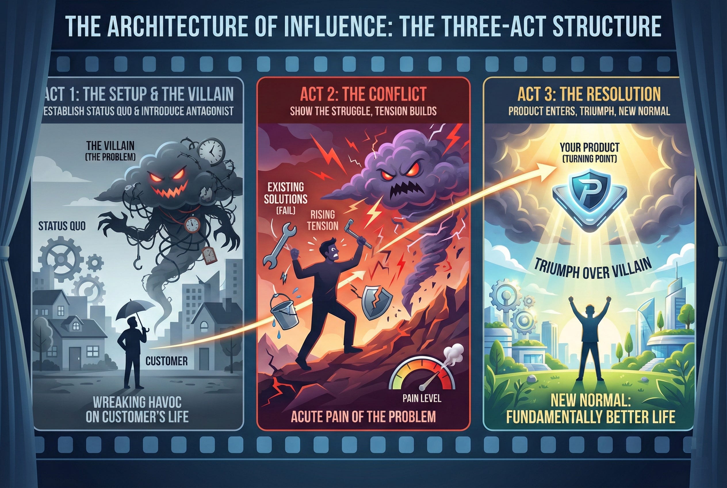 Act 1: The Setup and The Villain. Establish the status quo and introduce the antagonist. In business, the antagonist isn’t a person; it is the status quo problem wreaking havoc on the customer’s life.